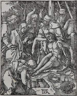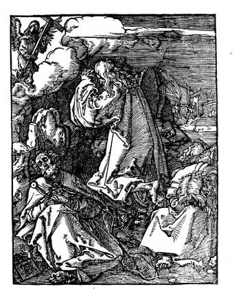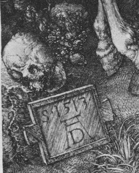 [7] Dürer’s earliest use of his famous AD monogram come in his 1498 Self-Portrait, with the note that the painting was executed when he was twenty-six. And from its first use here, looking “anchored” to the wall, the monogram became a character of sorts in his paintings and engravings: it later appears chiseled into a stone on which Christ is sitting; or the letters hang sign-like from a tree; or they “rest on the ground or are propped up on various surfaces”; in his Christ Cleansing the Temple, “the monogram, like the adjacent table, has been knocked over and partially falls out of the scene,” and in his depiction of the Garden of Gethsemane, the monogram is shown in the shade, as if it were as tired as St. Peter.