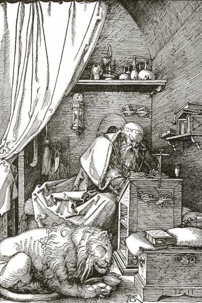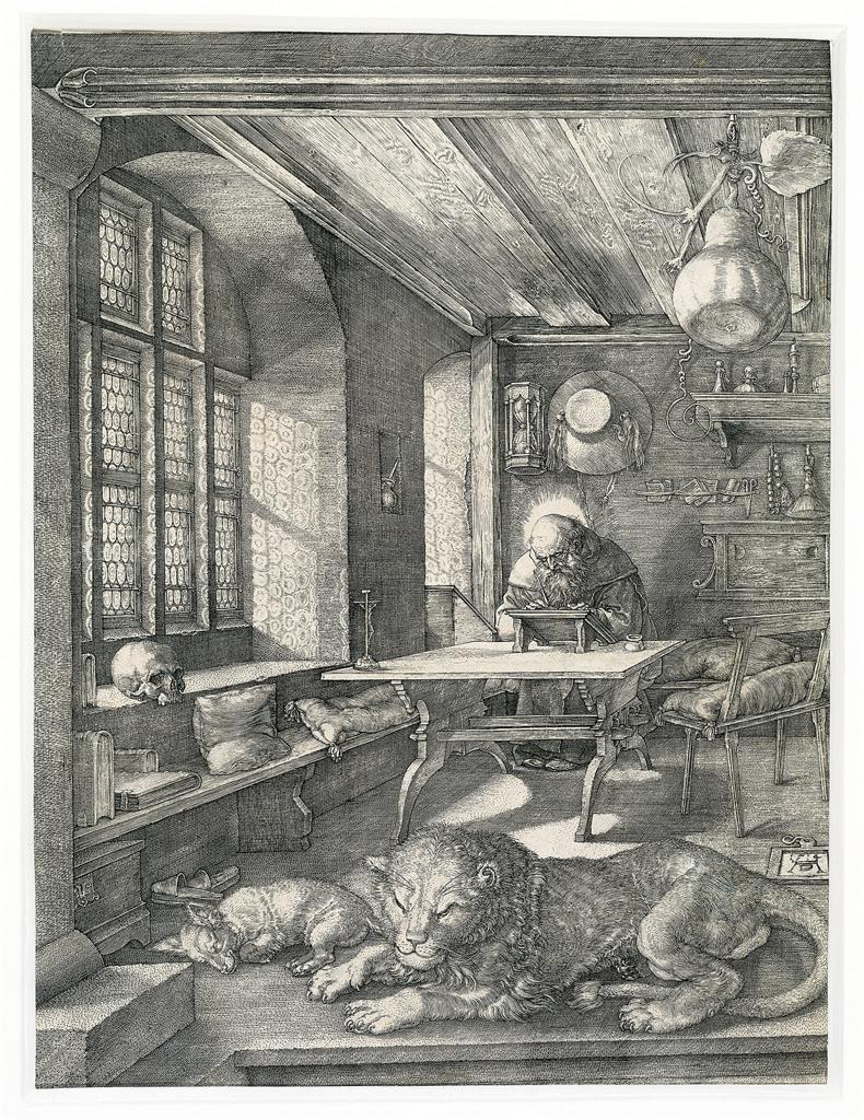 In this way, Jordan Kantor’s comparison of the depictions of the Passion of Christ to jazz standard—a kind of stock scene which could be redone many different ways—widens out to the entire history of art, to all figures, gestures, landscapes, symbols, and the rest. Not only a standard scene, whatever it might be, but the standard idea of a scene at all, a human figure at all, a landscape or cityscape at all. And we can see it at play also just in Dürer’s handling of the theme of St. Jerome, sometimes accompanied by a lion, studying and translating and writing.