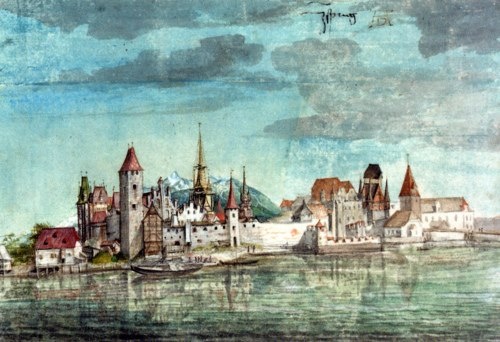 And there are others before these: between October, 1494 and May, 1495, Dürer traveled to Italy for the first time, ending up in Venice. The four-hundred thirty-mile trip, apparently taken because of an outbreak of plague in Nuremberg, could last as long as two weeks, and Dürer used the time to do a series of watercolor landscapes. Smith notes that Dürer would have first been exposed to city- and landscape art at Wolgemut’s shop, where detailed cityscapes (even birds-eye-views) were commissioned, or where specific landscapes or cities were placed in the background of religious scenes.