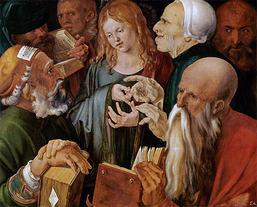 [8] In his Christ Carrying the Cross, Bosch crowds his Jesus around with a claustrophobic group of grotesque faces. Such depictions went along with the theories of the “physiognomic theorists” that associated “facial deformities … with specific character flaws.” So, just as contemporary thinkers and artists (such as Erasmus and Dürer) believed Christ to be “a man of medium height, with symmetrical, regular features, a fair complexion, thin beard and brownish-auburn hair,” his enemies were immediately recognizable by their ugliness. (This strategy continues to this day in Hollywood and popular fiction, where the good are beautiful and the evil are wormish and unpleasant-looking.) Unfortunately the appearance, specifically, of a large nose, many times shown in profile (such as Dürer’s Christ Among the Doctors) these “grotesques” were inevitably equated with Jews.