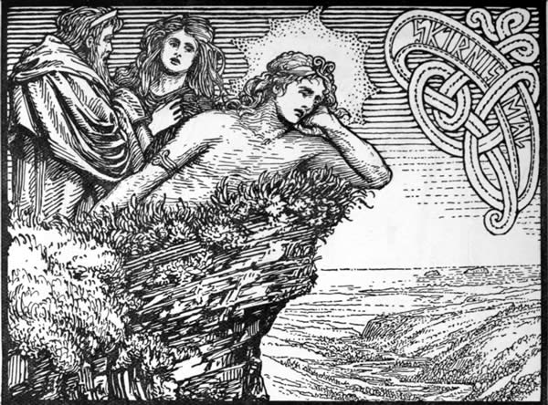 [High said:]“There was someone called Gymir, and his wife Aurboda. She was of the race of mountain-giants. Gerd is their daughter, the most beautiful of all women. It happened one day that Freyr had gone into Hlidskialf and was looking over all worlds, and when he looked to the north he saw on a certain homestead a large and beautiful building, and to this building went a woman, and when she lifted her arms and opened the door for herself, light was shed from her arms over both sky and sea, and all worlds were made bright by her. And his punishment for his great presumption in having sat in that holy seat was that he went away full of grief. And when he got home he said nothing, he neither slept nor drank; no one dared to try to speak with him. Then Niord sent for Freyr’s servant Skirnir, and bade him go to Freyr and try to get him to talk and ask who he was so angry with that he would not speak to anyone. Skirnir said he would go though he was not keen, and said unpleasant answers were to be expected from him. And when he got to Freyr he asked why Freyr was so downcast and would not speak to anyone. Then Freyr replied and said he had seen a beautiful woman and for her sake he was so full of grief that he would not live long if he were not to have her.