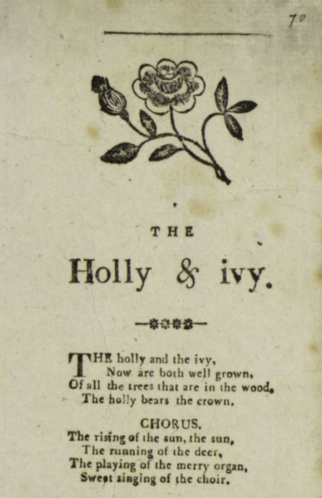 from c. 1525: Holly against Ivy Nay! nay! Ivy, It may not be, iwis: iwis/indeed For Holy must have the mastry, As the maner is. Holy bereth beris, Beris rede inough: The thristilcok, the popingay cock thrush, the parrot (?) Daunce in every bough. Welaway! sory Ivy, What fowles hast thou? But the sory owlet, That singeth “How! how!” Ivy bereth beris As black as any slo: Ther commeth the woode-colver wood-pigeon And fedeth her of tho. feed on them She lifteth up her taill, And she cackes or she go: And she leaves droppings before she goes She wold… Read more: 2 Early Versions of “The Holly and the Ivy”